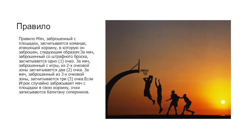 ПравилоПравило Мяч, заброшенный с площадки, засчитывается команде, атакующей корзину, в которую он заброшен, следующим образом:За мяч, заброшенный