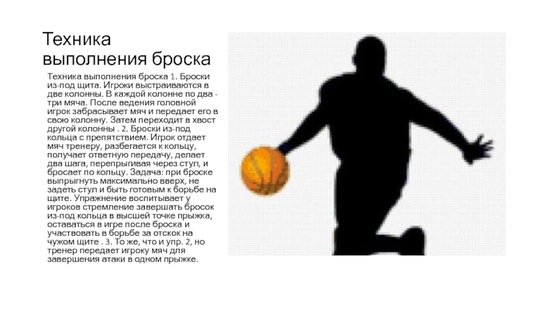 в две колонны. В каждой колонне по два - три мяча. После ведения головной игрок забрасывает мяч и передает его в свою колонну. Затем переходит в хвост другой колонны . 2. Броски из-под кольца с препятствием. Игрок отдает мяч тренеру, разбегается к кольцу, получает ответную передачу, делает два шага, перепрыгивая через стул, и бросает по кольцу. Задача: при броске выпрыгнуть максимально вверх, не задеть стул и быть готовым к борьбе на щите. Упражнение воспитывает у игроков стремление завершать бросок из-под кольца в высшей точке прыжка, оставаться в игре после броска и участвовать в борьбе за отскок на чужом щите . 3. То же, что и упр. 2, но тренер передает игроку мяч для завершения атаки в одном прыжке.