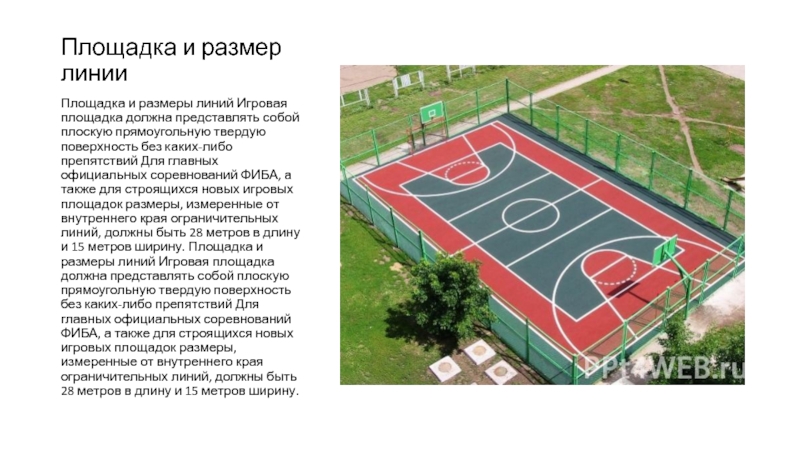собой плоскую прямоугольную твердую поверхность без каких-либо препятствий Для главных официальных соревнований ФИБА, а также для строящихся новых игровых площадок размеры, измеренные от внутреннего края ограничительных линий, должны быть 28 метров в длину и 15 метров ширину. Площадка и размеры линий Игровая площадка должна представлять собой плоскую прямоугольную твердую поверхность без каких-либо препятствий Для главных официальных соревнований ФИБА, а также для строящихся новых игровых площадок размеры, измеренные от внутреннего края ограничительных линий, должны быть 28 метров в длину и 15 метров ширину.