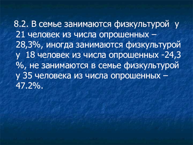 из числа опрошенных – 28,3%, иногда занимаются физкультурой у 18 человек из числа опрошенных -24,3 %, не занимаются в семье физкультурой у 35 человека из числа опрошенных – 47.2%.
