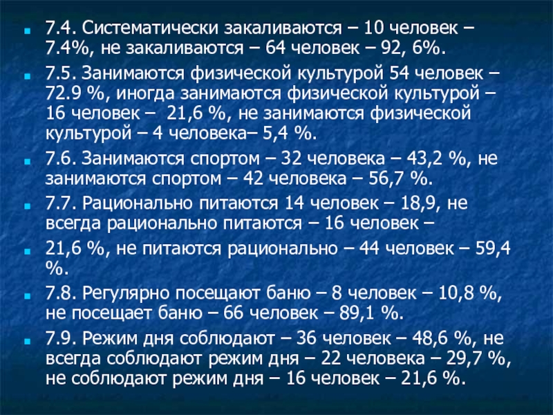 Слайд 287.4. Систематически закаливаются – 10 человек – 7.4%, не закаливаются –