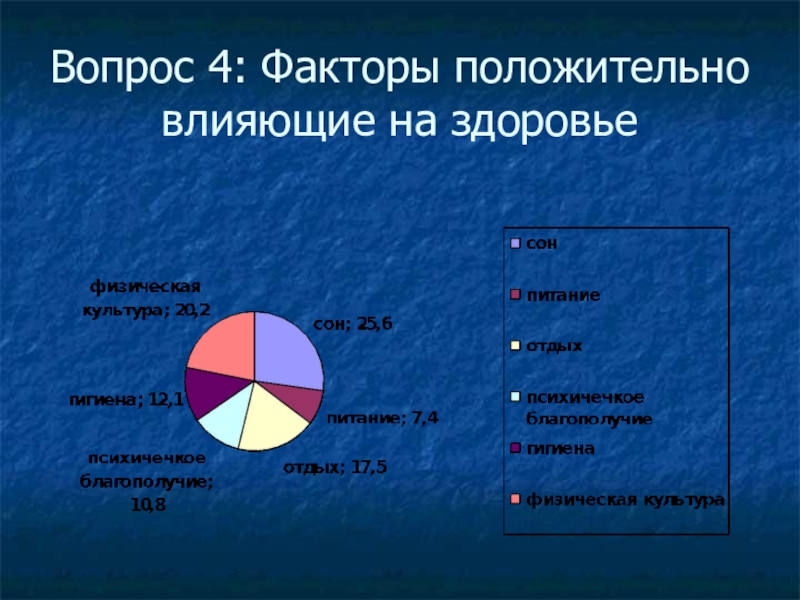 Слайд 23Вопрос 4: Факторы положительно влияющие на здоровье