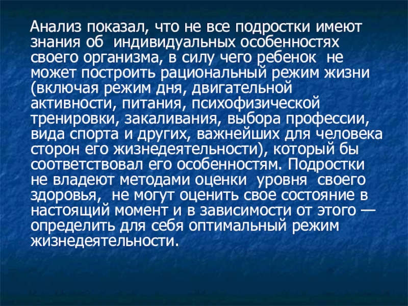 индивидуальных особенностях своего организма, в силу чего ребенок не может построить рациональный режим жизни (включая режим дня, двигательной активности, питания, психофизической тренировки, закаливания, выбора профессии, вида спорта и других, важнейших для человека сторон его жизнедеятельности), который бы соответствовал его особенностям. Подростки не владеют методами оценки уровня своего здоровья, не могут оценить свое состояние в настоящий момент и в зависимости от этого — определить для себя оптимальный режим жизнедеятельности.