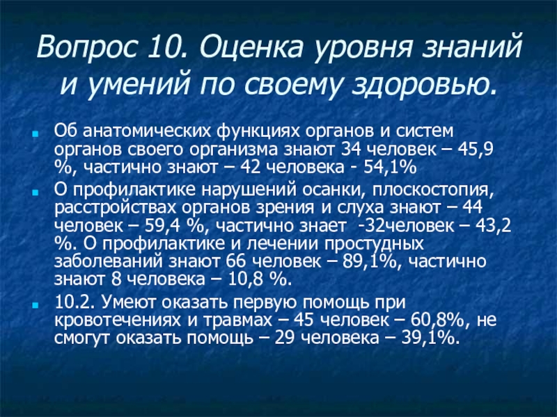 Слайд 37Вопрос 10. Оценка уровня знаний и умений по своему здоровью.