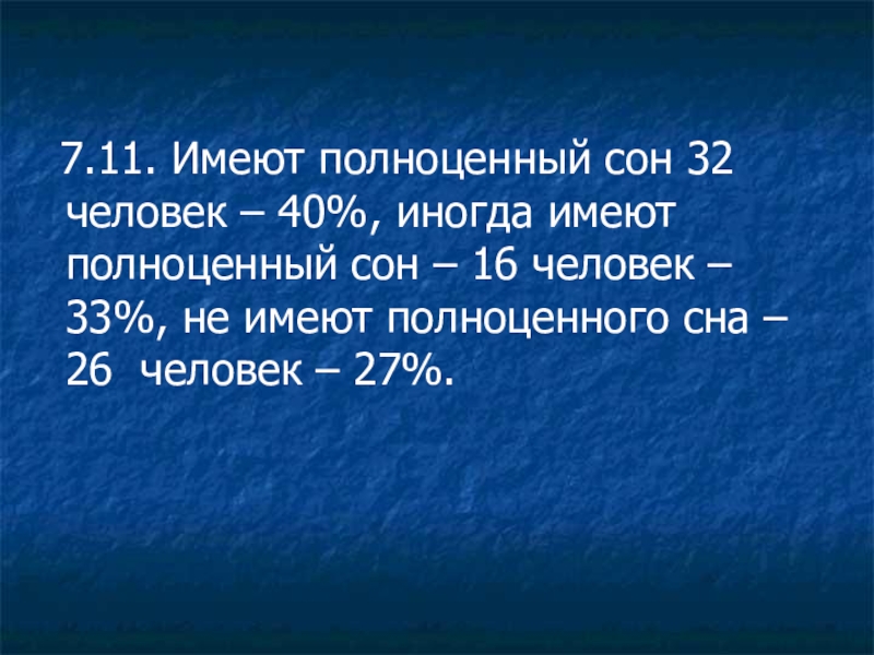Слайд 30 7.11. Имеют полноценный сон 32 человек – 40%, иногда имеют
