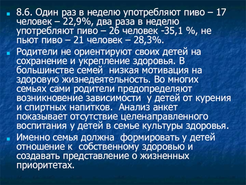 Родители не ориентируют своих детей на сохранение и укрепление здоровья. В большинстве семей низкая мотивация на здоровую жизнедеятельность. Во многих семьях сами родители предопределяют возникновение зависимости у детей от курения и спиртных напитков. Анализ анкет показывает отсутствие целенаправленного воспитания у детей в семье культуры здоровья.