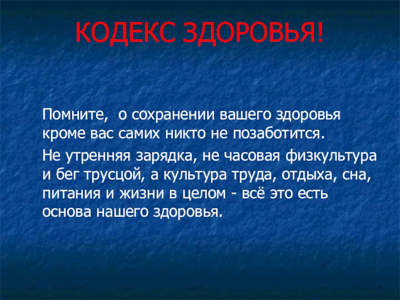 Не утренняя зарядка, не часовая физкультура и бег трусцой, а культура труда, отдыха, сна, питания и жизни в целом - всё это есть основа нашего здоровья.