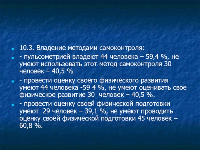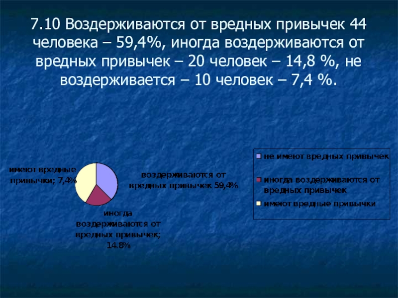 Слайд 297.10 Воздерживаются от вредных привычек 44 человека – 59,4%, иногда воздерживаются