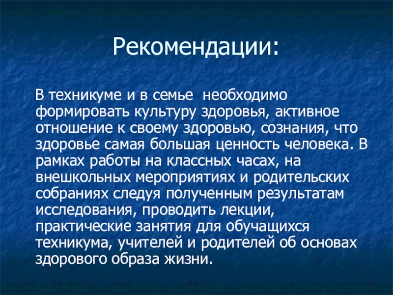 активное отношение к своему здоровью, сознания, что здоровье самая большая ценность человека. В рамках работы на классных часах, на внешкольных мероприятиях и родительских собраниях следуя полученным результатам исследования, проводить лекции, практические занятия для обучащихся техникума, учителей и родителей об основах здорового образа жизни.
