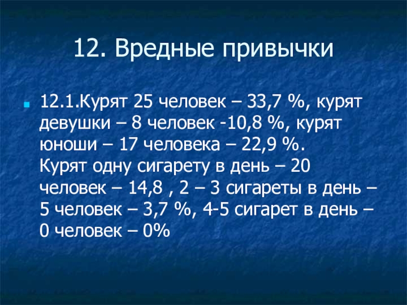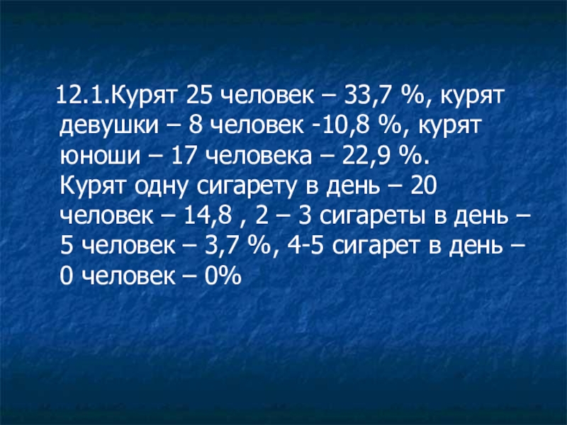 Слайд 44 12.1.Курят 25 человек – 33,7 %, курят девушки – 8