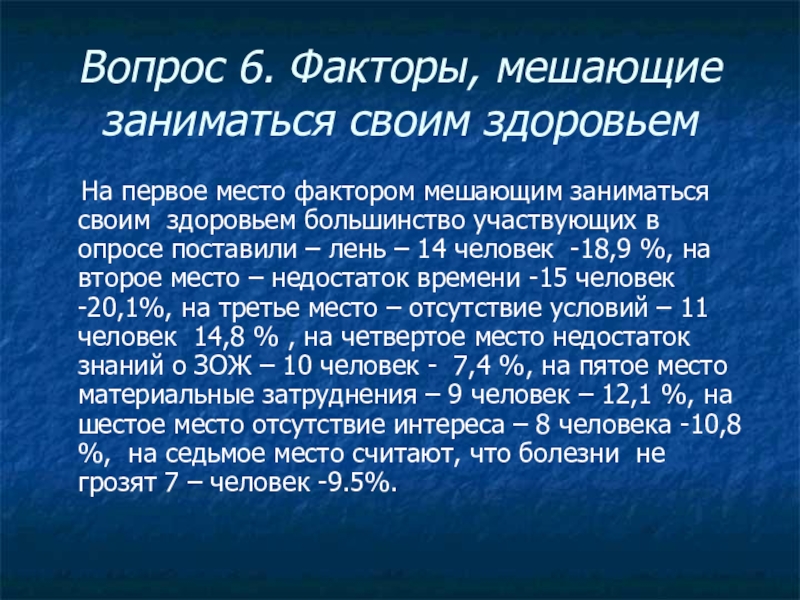 Слайд 25Вопрос 6. Факторы, мешающие заниматься своим здоровьем