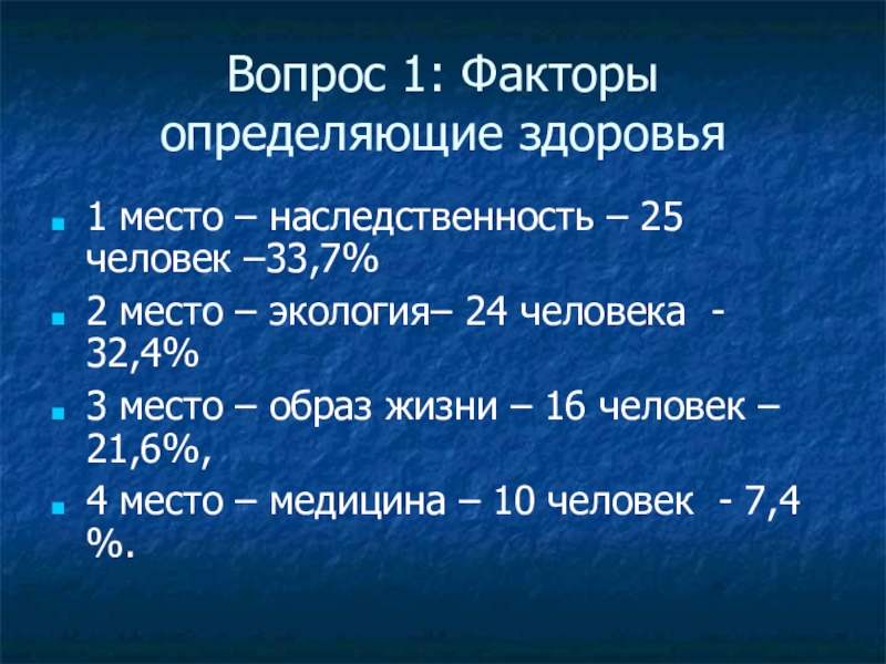 Слайд 20Вопрос 1: Факторы определяющие здоровья