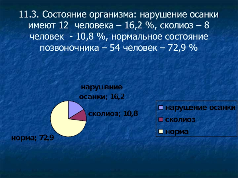Слайд 4211.3. Состояние организма: нарушение осанки имеют 12 человека – 16,2 %,
