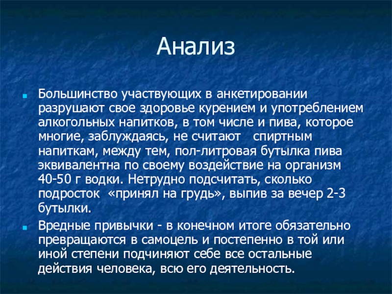 напитков, в том числе и пива, которое многие, заблуждаясь, не считают спиртным напиткам, между тем, пол-литровая бутылка пива эквивалентна по своему воздействие на организм 40-50 г водки. Нетрудно подсчитать, сколько подросток «принял на грудь», выпив за вечер 2-3 бутылки.