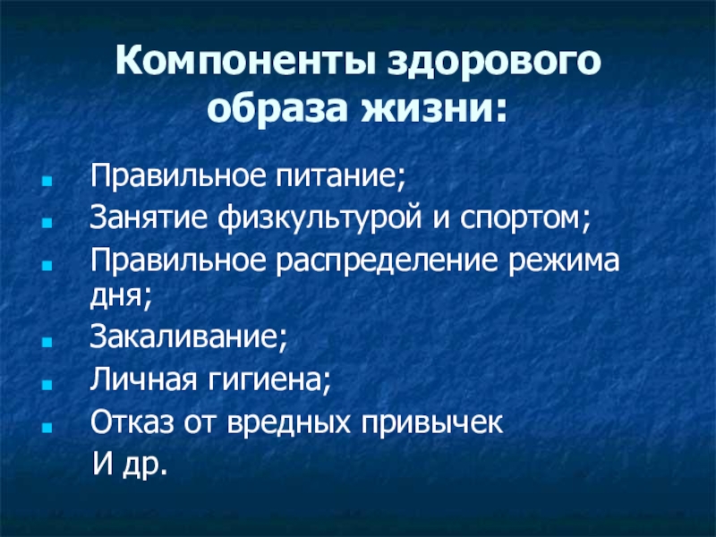 быть здоровым, недостаточно только заниматься спортом, нужно ещё соблюдать множество различных правил. В работе указаны не все компоненты здорового образа жизни, их существует великое множество. Мы перечислили самые основные компоненты, которые проще всего соблюдать, а вернее они основные, на них и лежит основа смысла здорового образа жизни.