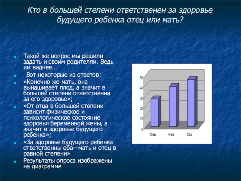 Слайд 47Кто в большей степени ответственен за здоровье будущего ребенка отец или