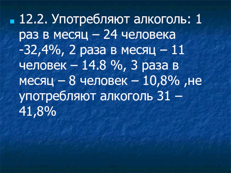 Слайд 4512.2. Употребляют алкоголь: 1 раз в месяц – 24 человека -32,4%,