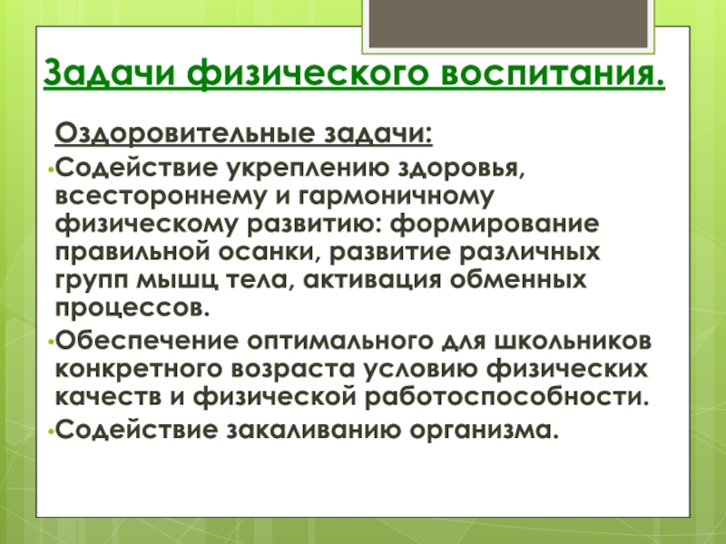Обеспечение оптимального для школьников конкретного возраста условию физических качеств и физической работоспособности.