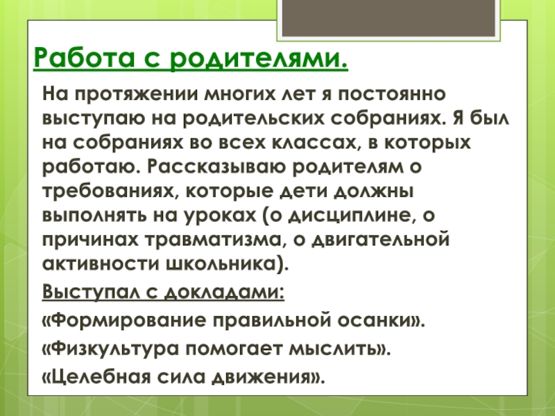 собраниях. Я был на собраниях во всех классах, в которых работаю. Рассказываю родителям о требованиях, которые дети должны выполнять на уроках (о дисциплине, о причинах травматизма, о двигательной активности школьника).