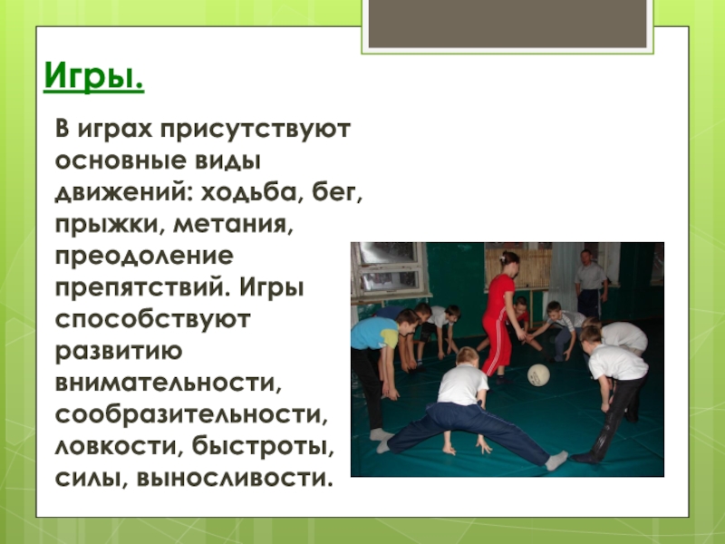 Слайд 10В играх присутствуют основные виды движений: ходьба, бег, прыжки, метания, преодоление
