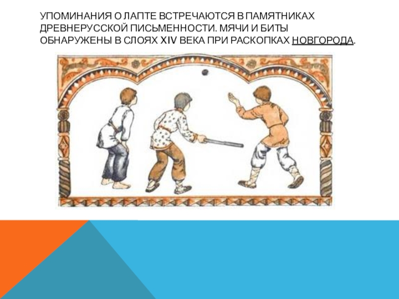 Слайд 3Упоминания о лапте встречаются в памятниках древнерусской письменности. Мячи и биты