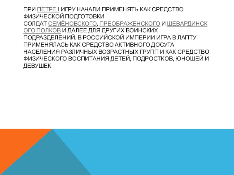 Слайд 6При Петре I игру начали применять как средство физической подготовки солдат Семёновского, Преображенского и Шевардинского полков и далее