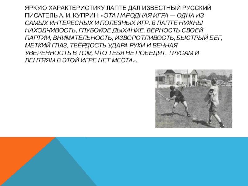 Слайд 5Яркую характеристику лапте дал известный русский писатель А. И. Куприн: «Эта народная игра — одна