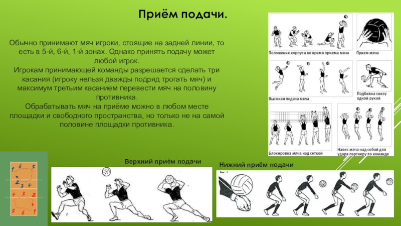 Площадка по количеству игроков условно разделена на 6 зон. После каждого перехода право подачи переходит от одной команды к другой в результате розыгрыша очка, игроки перемещаются в следующую зону по часовой стрелке.