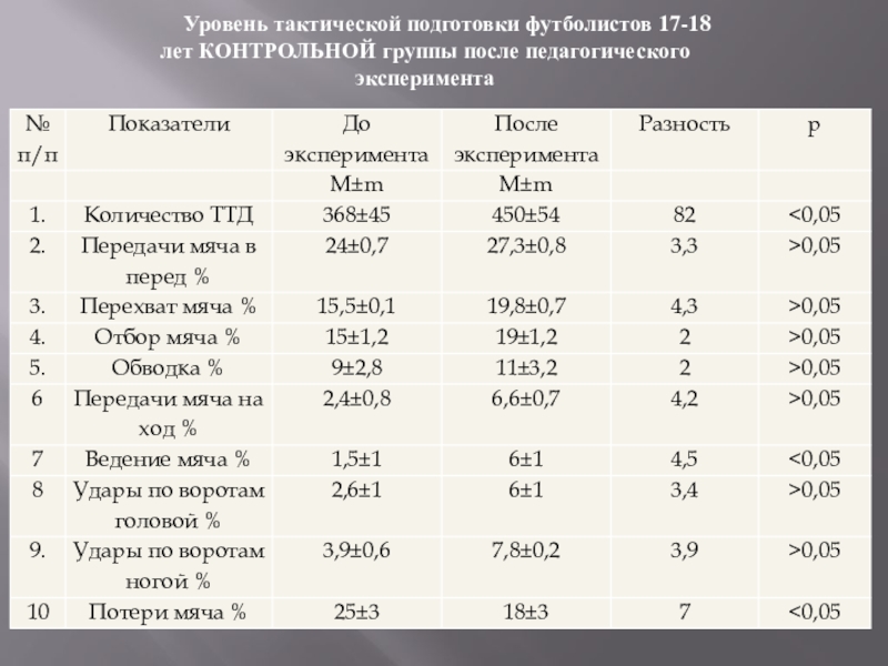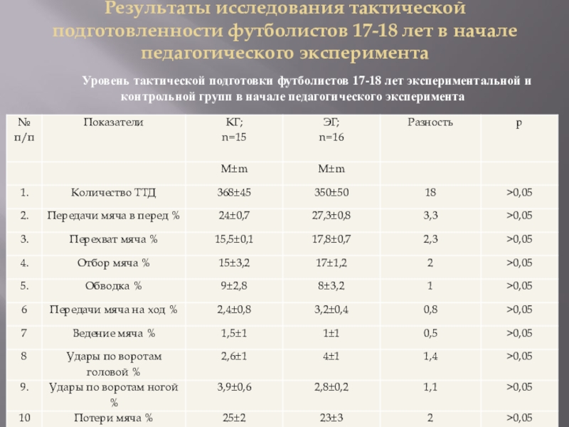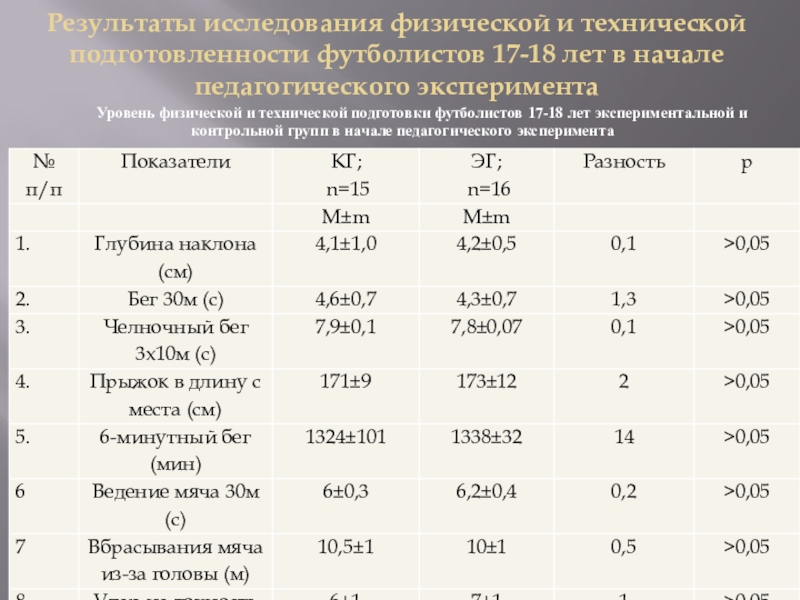 Уровень физической и технической подготовки футболистов 17-18 лет экспериментальной и контрольной групп в начале педагогического эксперимента