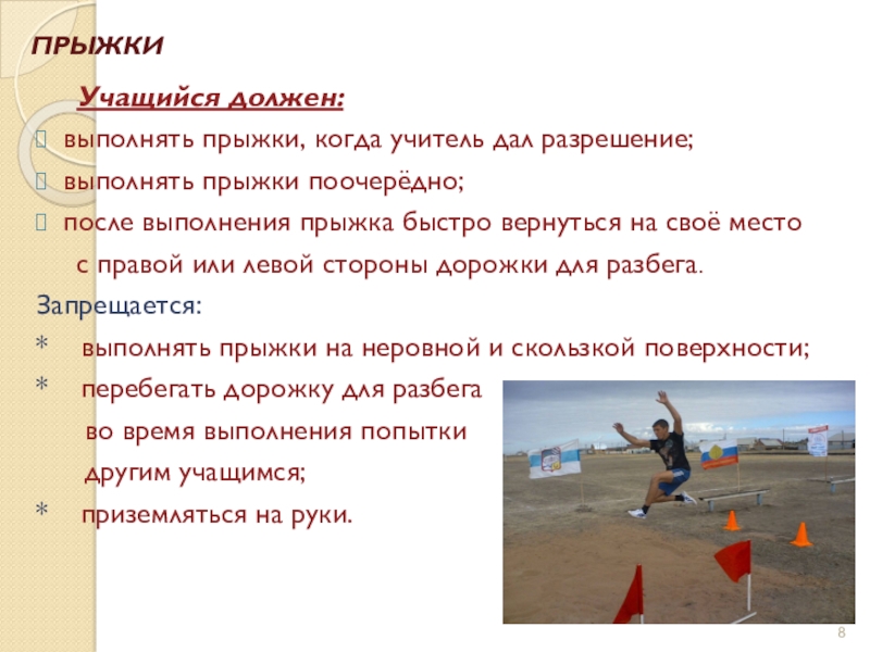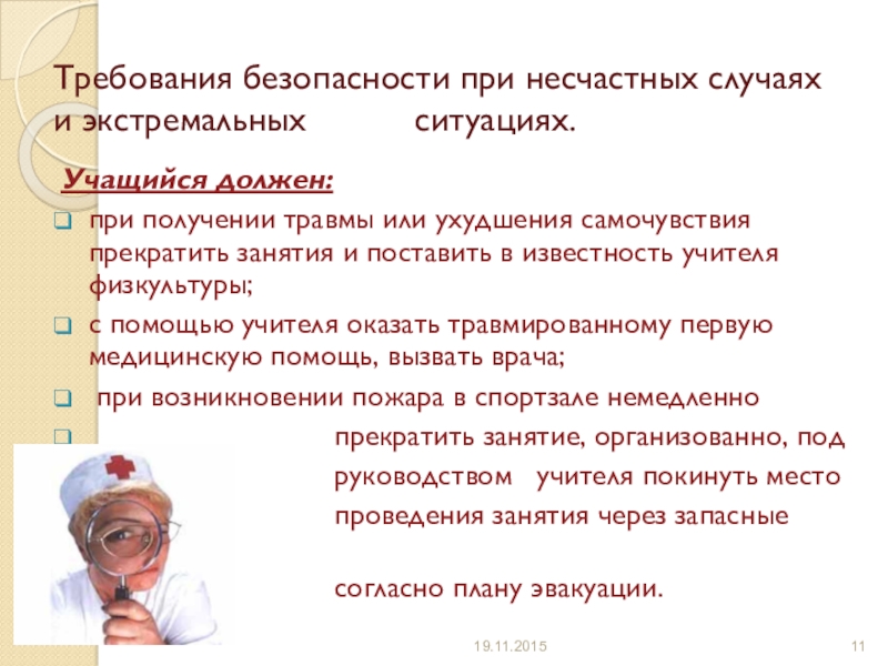 при получении травмы или ухудшения самочувствия прекратить занятия и поставить в известность учителя физкультуры;