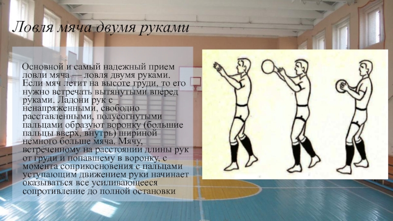 Для того чтобы правильно поймать мяч одной или двумя руками, нужно ясно представить себе весь процесс этого действия.