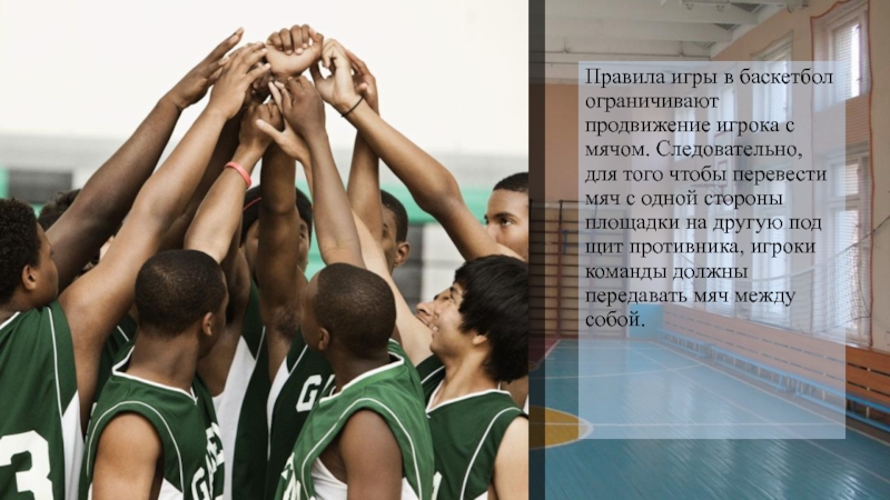 Слайд 6Правила игры в баскетбол ограничивают продвижение игрока с мячом. Следовательно, для