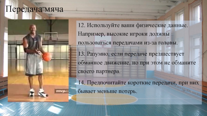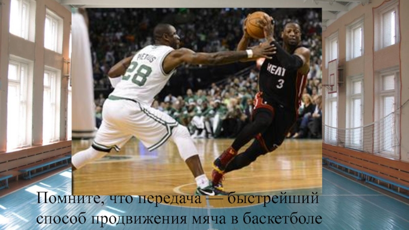 Слайд 15Помните, что передача — быстрейший способ продвижения мяча в баскетболе