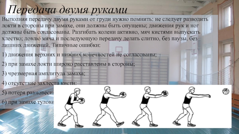Выполняя передачу двумя руками от груди нужно помнить: не