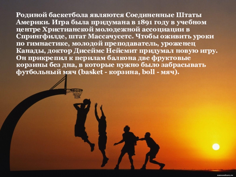 году в учебном центре Христианской молодежной ассоциации в Спрингфилде, штат Массачусетс. Чтобы оживить уроки по гимнастике, молодой преподаватель, уроженец Канады, доктор Дисеймс Нейсмит придумал новую игру. Он прикрепил к перилам балкона две фруктовые корзины без дна, в которые нужно было забрасывать футбольный мяч (basket - корзина, boll - мяч).