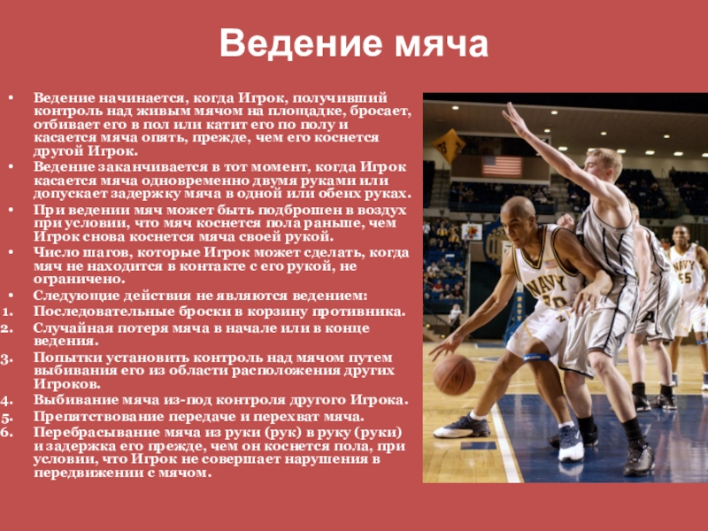 Ведение заканчивается в тот момент, когда Игрок касается мяча одновременно двумя руками или допускает задержку мяча в одной или обеих руках.