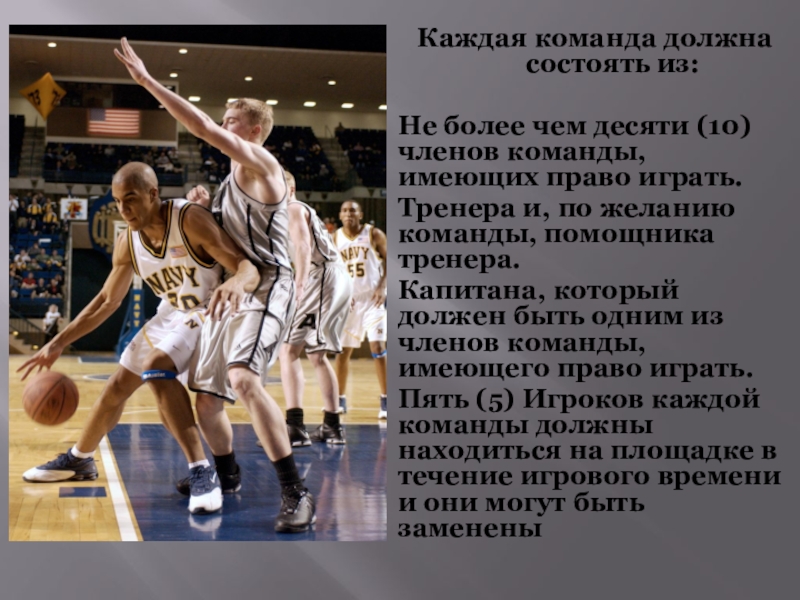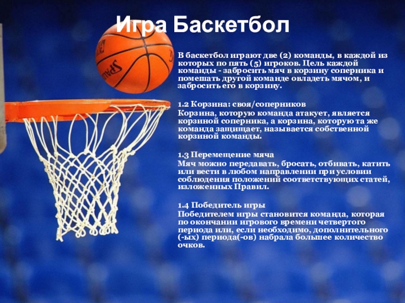 которых по пять (5) игроков. Цель каждой команды - забросить мяч в корзину соперника и помешать другой команде овладеть мячом, и забросить его в корзину.