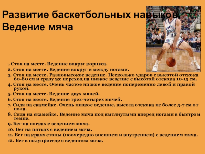 3. Стоя на месте. Разновысокое ведение. Несколько ударов с высотой отскока 60-80 см и сразу же переход на низкое ведение с высотой отскока 10-15 см.
