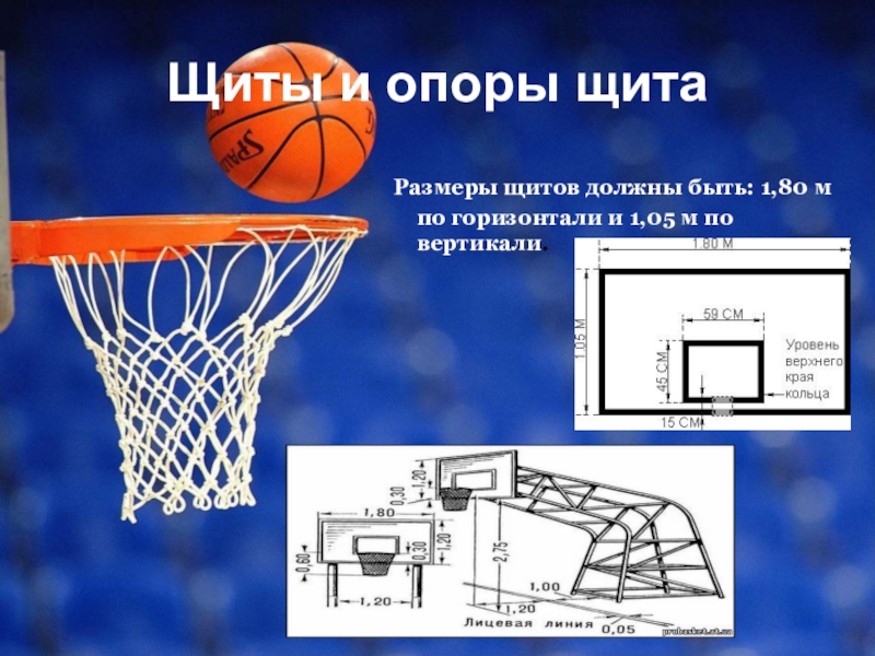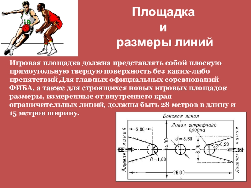 поверхность без каких-либо препятствий Для главных официальных соревнований ФИБА, а также для строящихся новых игровых площадок размеры, измеренные от внутреннего края ограничительных линий, должны быть 28 метров в длину и 15 метров ширину.