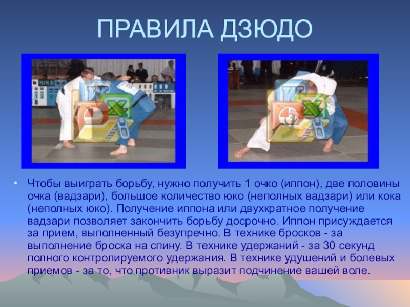 Чтобы выигpать боpьбу, нужно получить 1 очко (иппон), две половины очка