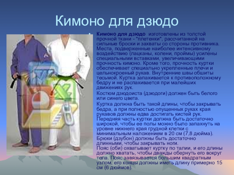 "плетенки", рассчитанной на сильные броски и захваты со стороны противника. Места, подверженные наиболее интенсивному воздействию (лацканы, колени, проймы) усилены специальными вставками, увеличивающими прочность кимоно. Кроме того, прочность куртки обеспечивает специально укрепленные плечи и цельнокроеный рукав. Внутренние швы обшиты тесьмой. Куртка запахивается к противоположному бедру и не распахивается при малейших движениях рук.