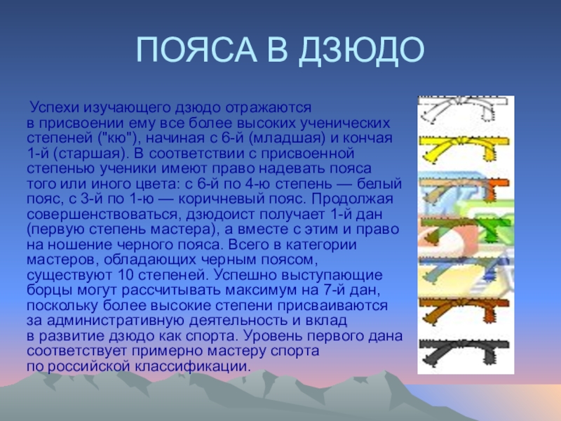 ему все более высоких ученических степеней ("кю"), начиная с 6-й (младшая) и кончая 1-й (старшая). В соответствии с присвоенной степенью ученики имеют право надевать пояса того или иного цвета: c 6-й по 4-ю степень — белый пояс, с 3-й по 1-ю — коричневый пояс. Продолжая совершенствоваться, дзюдоист получает 1-й дан (первую степень мастера), а вместе с этим и право на ношение черного пояса. Всего в категории мастеров, обладающих черным поясом, существуют 10 степеней. Успешно выступающие борцы могут рассчитывать максимум на 7-й дан, поскольку более высокие степени присваиваются за административную деятельность и вклад в развитие дзюдо как спорта. Уровень первого дана соответствует примерно мастеру спорта по российской классификации.