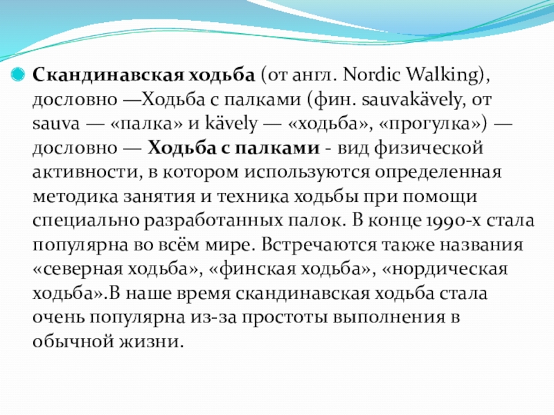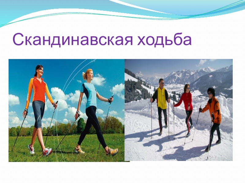 Слайд 10Скандинавская ходьба (от англ. Nordic Walking), дословно —Ходьба с палками (фин.