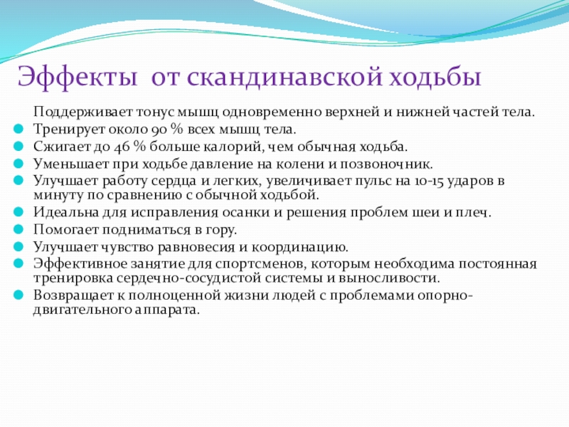 Улучшает работу сердца и легких, увеличивает пульс на 10-15 ударов в минуту по сравнению с обычной ходьбой.