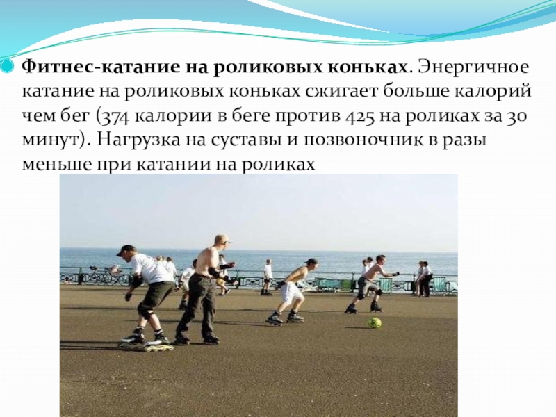 Слайд 4Фитнес-катание на роликовых коньках. Энергичное катание на роликовых коньках сжигает больше