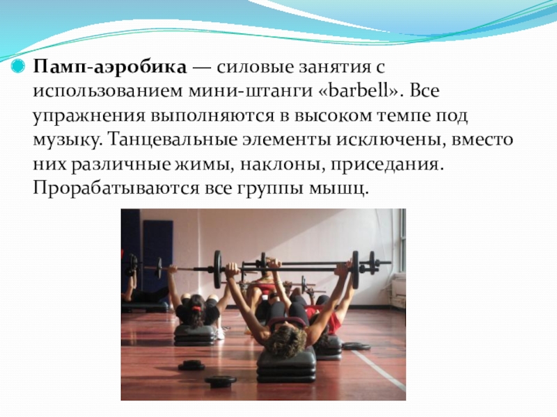 Слайд 6Памп-аэробика — силовые занятия с использованием мини-штанги «barbell». Все упражнения выполняются в