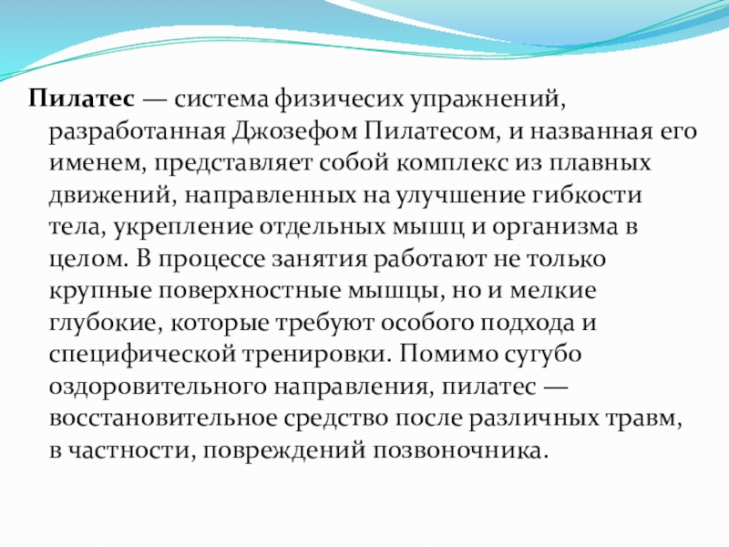 Слайд 18Пилатес — система физичесих упражнений, разработанная Джозефом Пилатесом, и названная его именем,