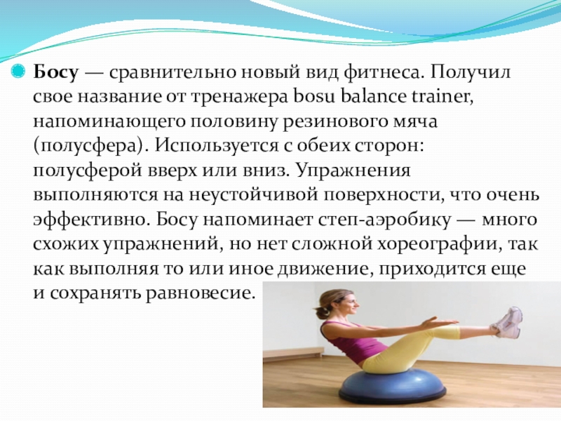 Слайд 7Босу — сравнительно новый вид фитнеса. Получил свое название от тренажера bosu