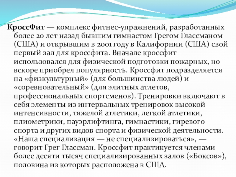 Глассманом (США) и открывшим в 2001 году в Калифорнии (США) свой первый зал для кроссфита. Вначале кроссфит использовался для физической подготовки пожарных, но вскоре приобрел популярность. Кроссфит подразделяется на «физкультурный» (для большинства людей) и «соревновательный» (для элитных атлетов, профессиональных спортсменов). Тренировки включают в себя элементы из интервальных тренировок высокой интенсивности, тяжелой атлетики, легкой атлетики, плиометрики, пауэрлифтинга, гимнастики, гиревого спорта и других видов спорта и физической деятельности. «Наша специализация — не специализироваться», — говорит Грег Глассман. Кроссфит практикуется членами более десяти тысяч специализированных залов («Боксов»), половина из которых расположена в США.