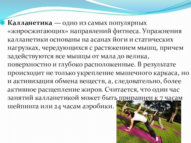 Слайд 9Калланетика — одно из самых популярных «жиросжигающих» направлений фитнеса. Упражнения калланетики основаны